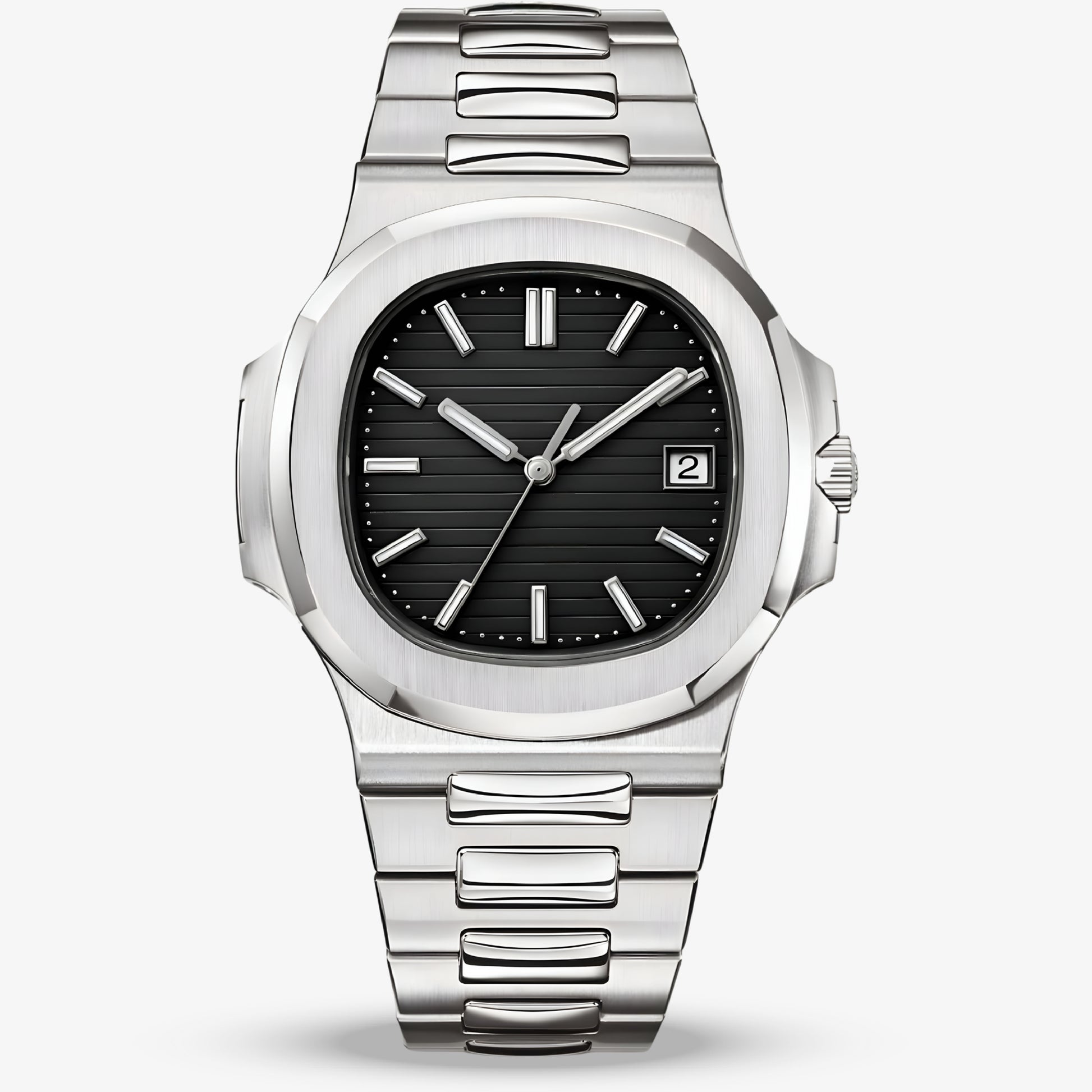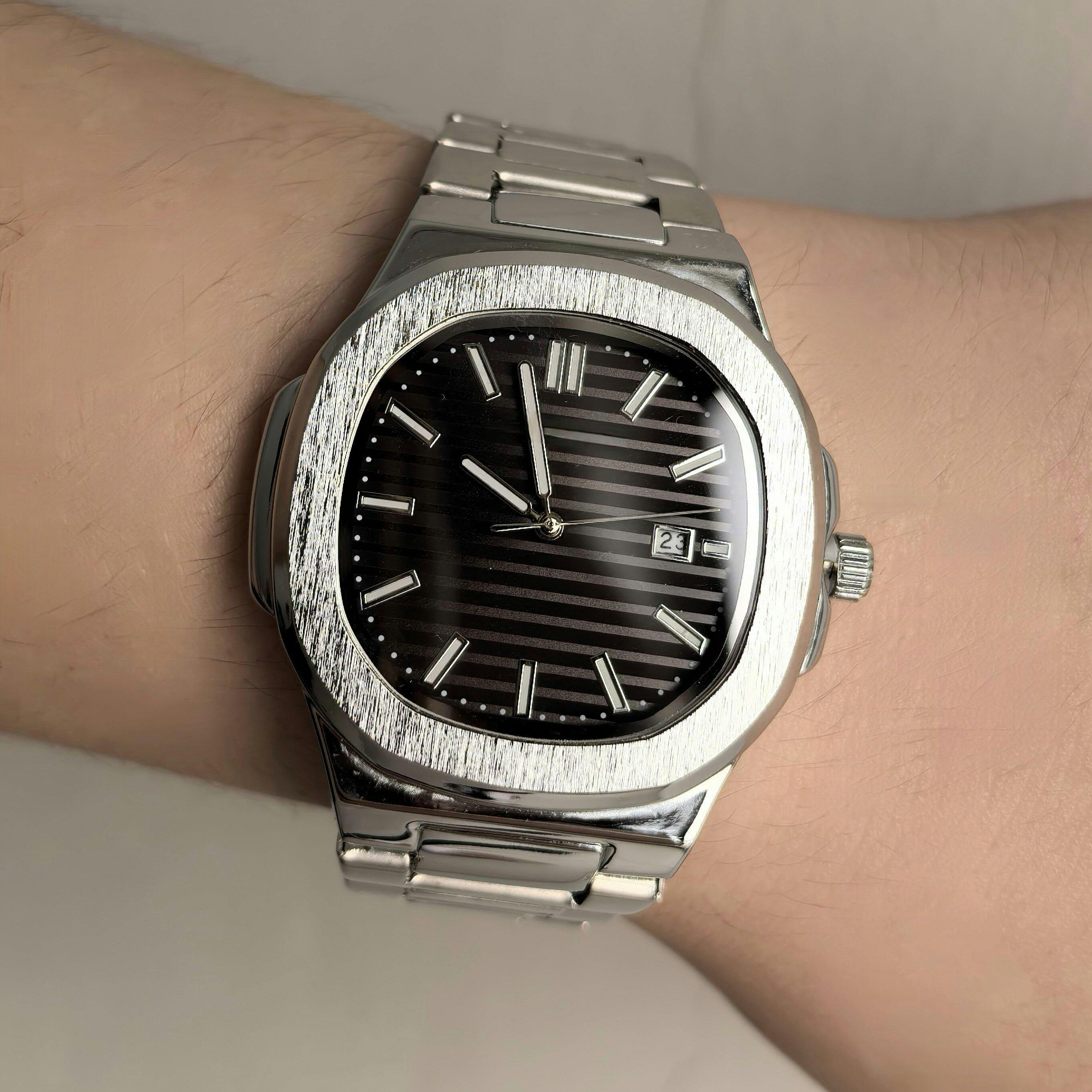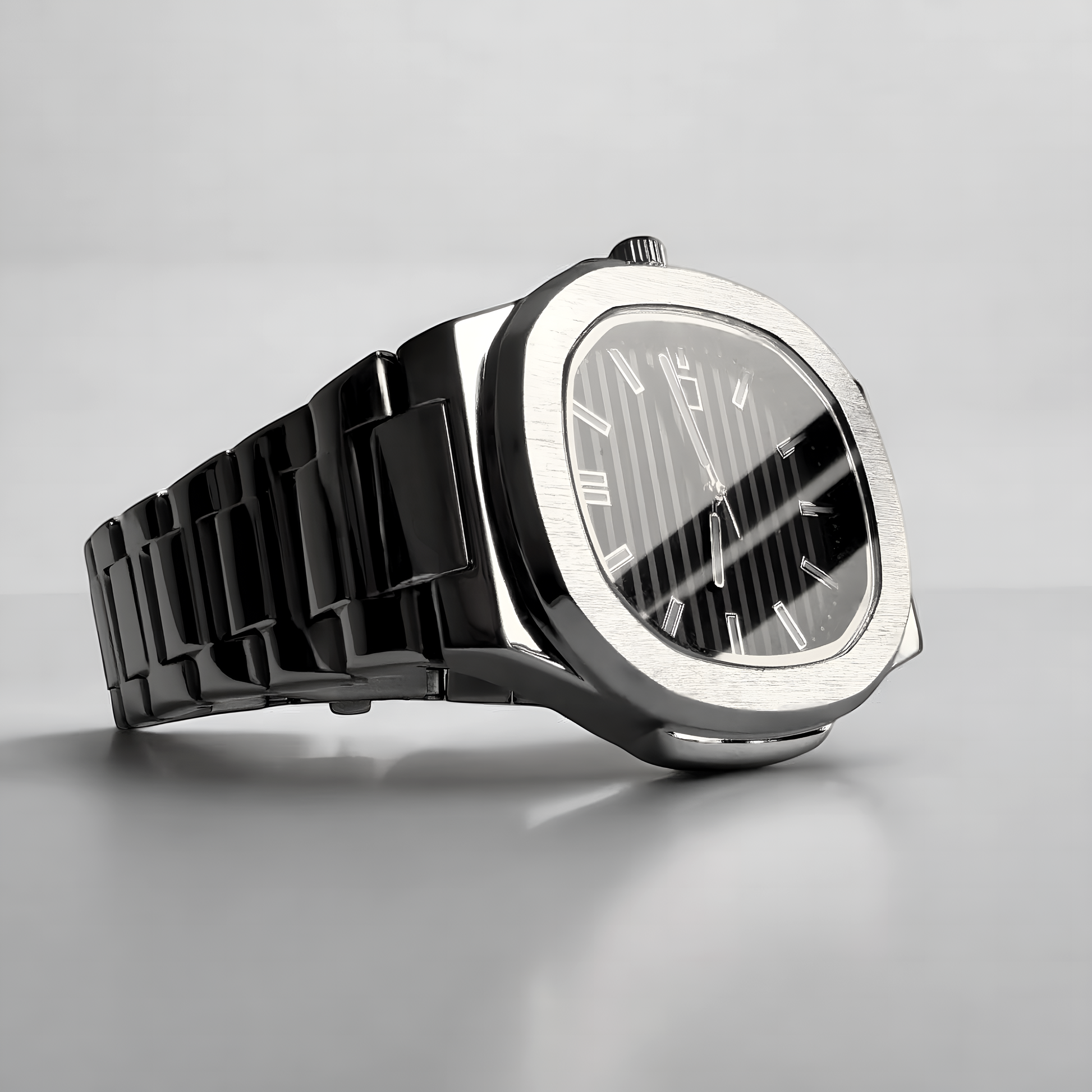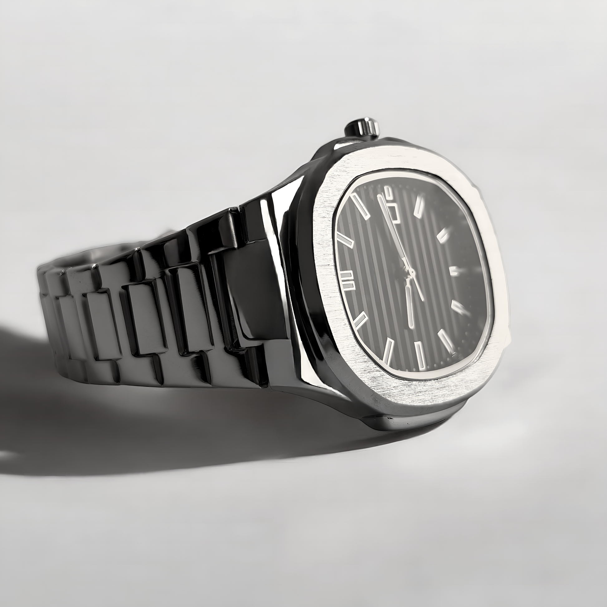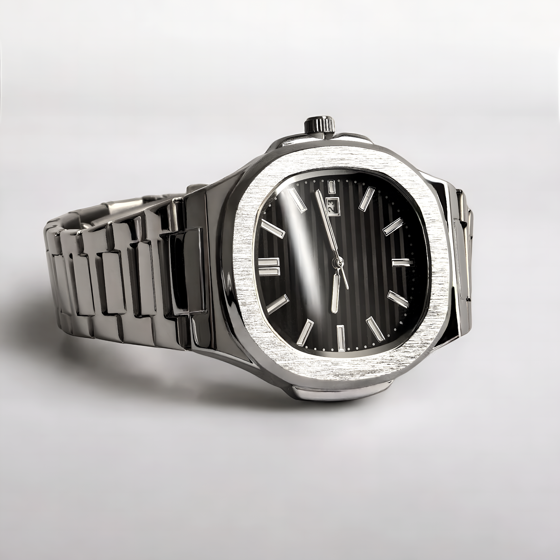 Aeternum Ferrum presenta un diseño elegante y moderno, fabricado en acero inoxidable de la más alta calidad con movimiento de cuarzo de alta precisión y resistencia al agua. Presenta una esfera negra texturizada con marcadores metálicos, función de fecha y brazalete a juego, ideal para uso diario o formal.