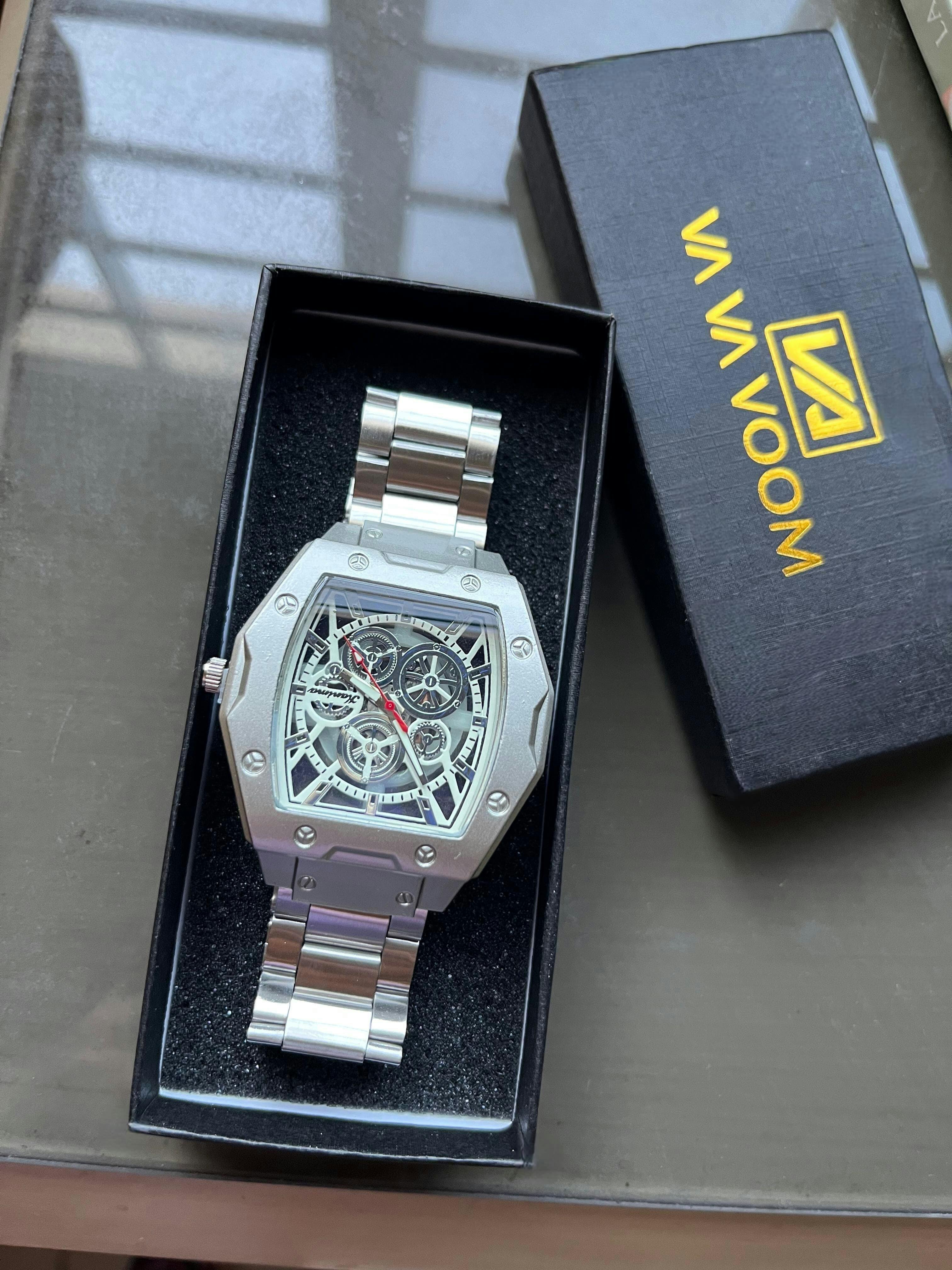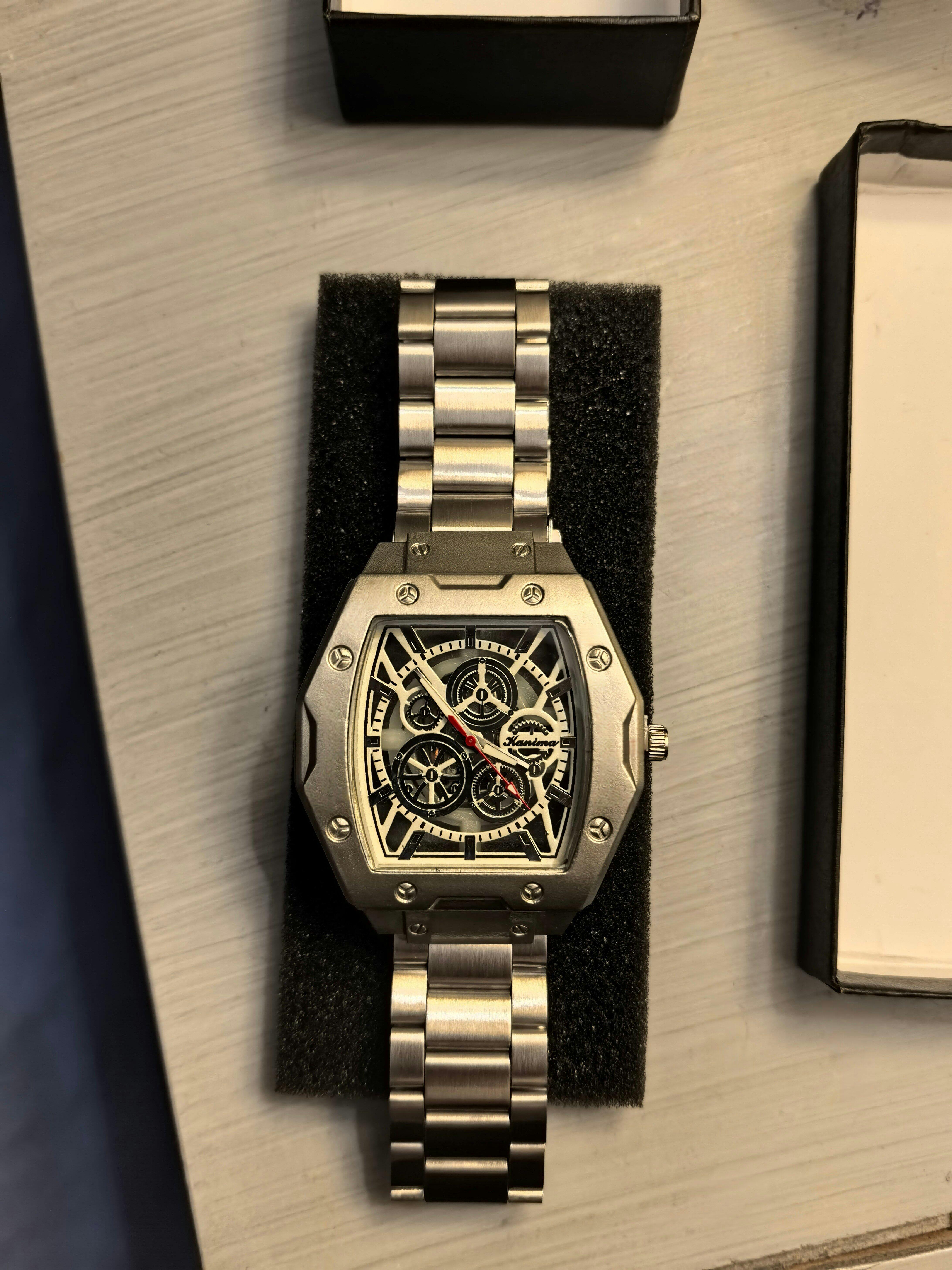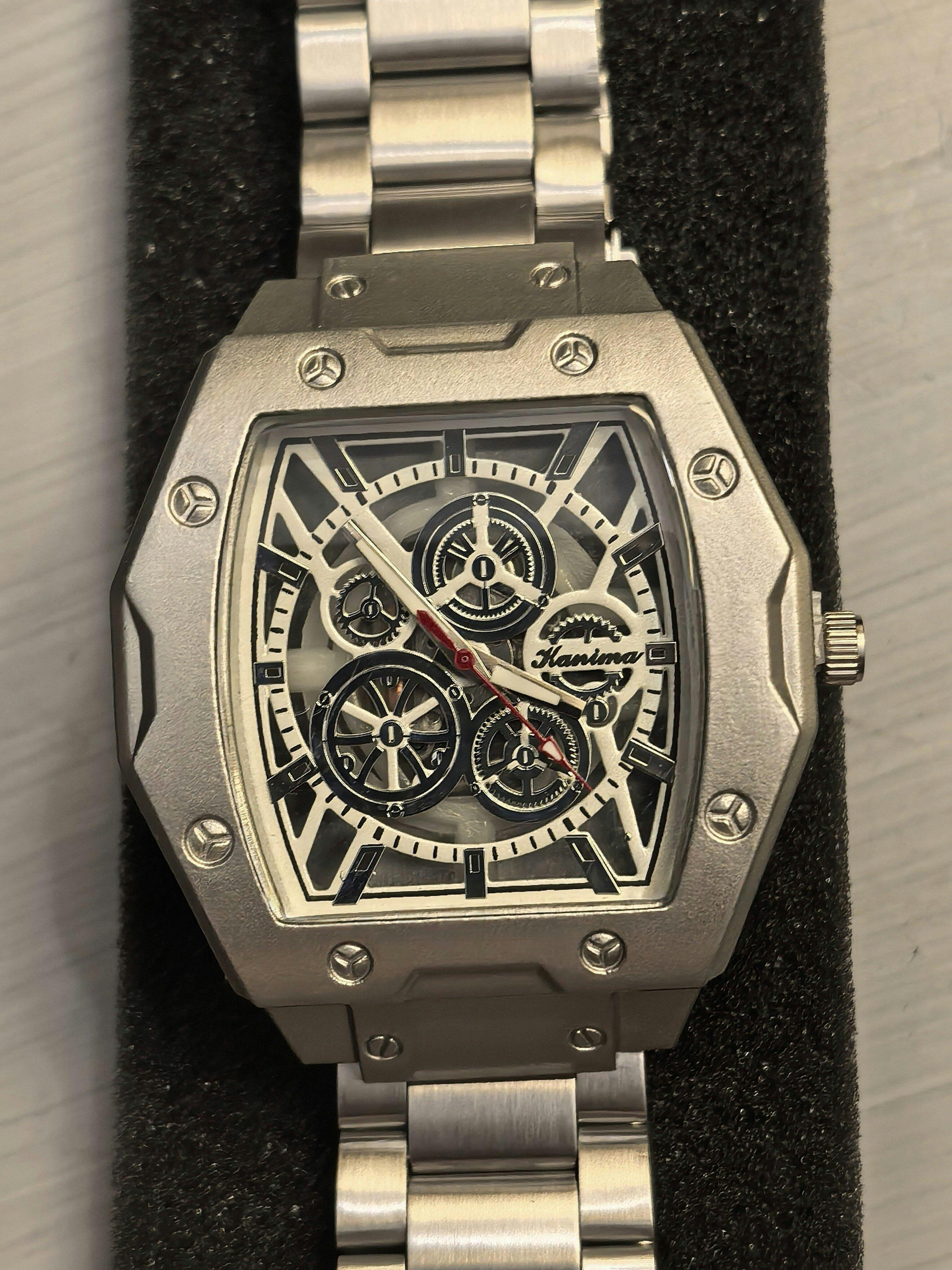 El Aether Mechanique es un reloj de alta gama fabricado en acero inoxidable, que combina un diseño vanguardista con una estructura robusta y elegante. Su esfera esqueletizada revela el intrincado mecanismo interno, destacando subesférases funcionales y detalles técnicos que reflejan precisión y sofisticación. Equipado con agujas luminiscentes y un segundero central en rojo, ofrece excelente legibilidad, mientras que su resistencia al agua de hasta 100 metros lo hace apto tanto para el uso diario como para ocasiones especiales. Con un bisel atornillado y acabados de alto nivel, el Aether Mechanique se presenta como una pieza distintiva que encarna la esencia de la relojería moderna.