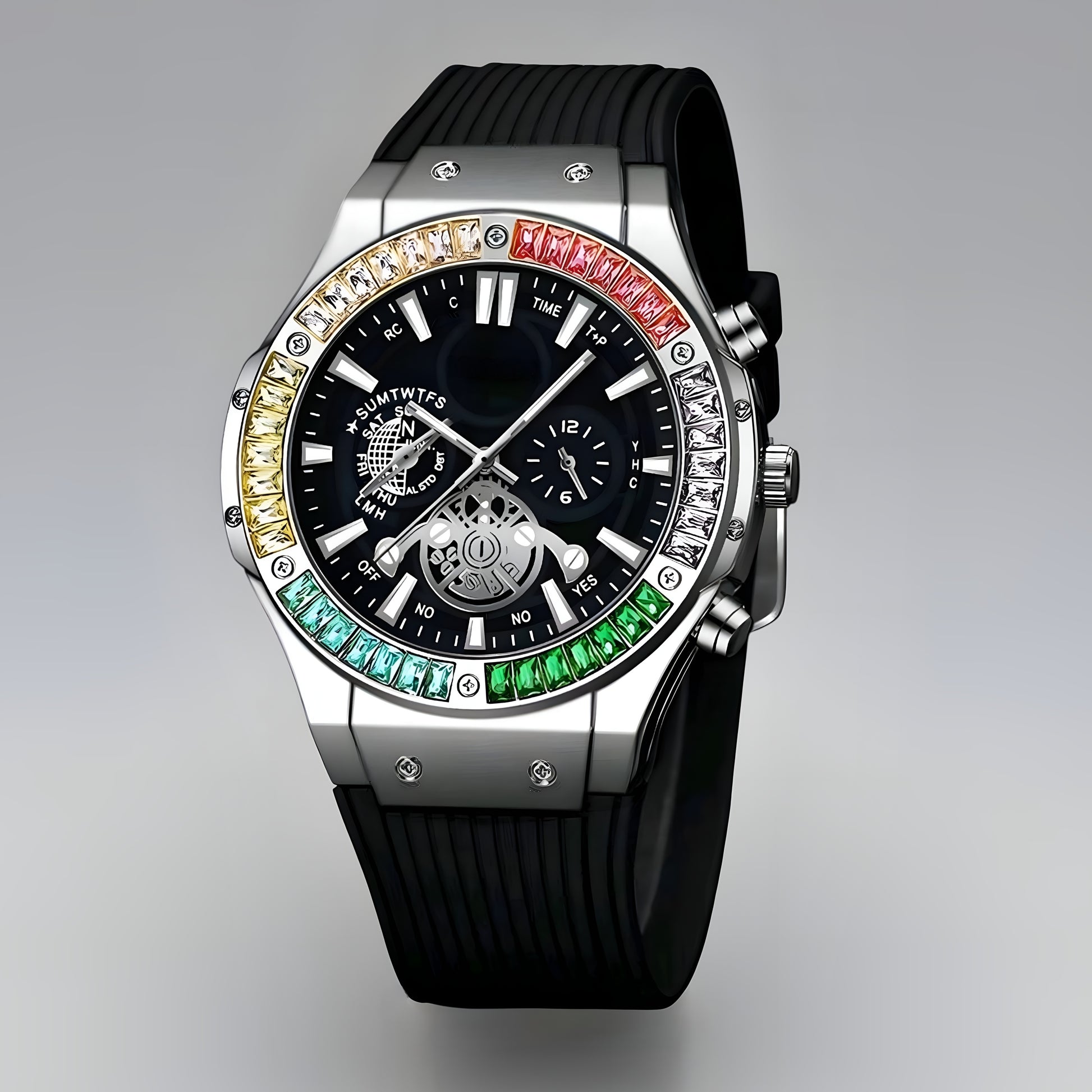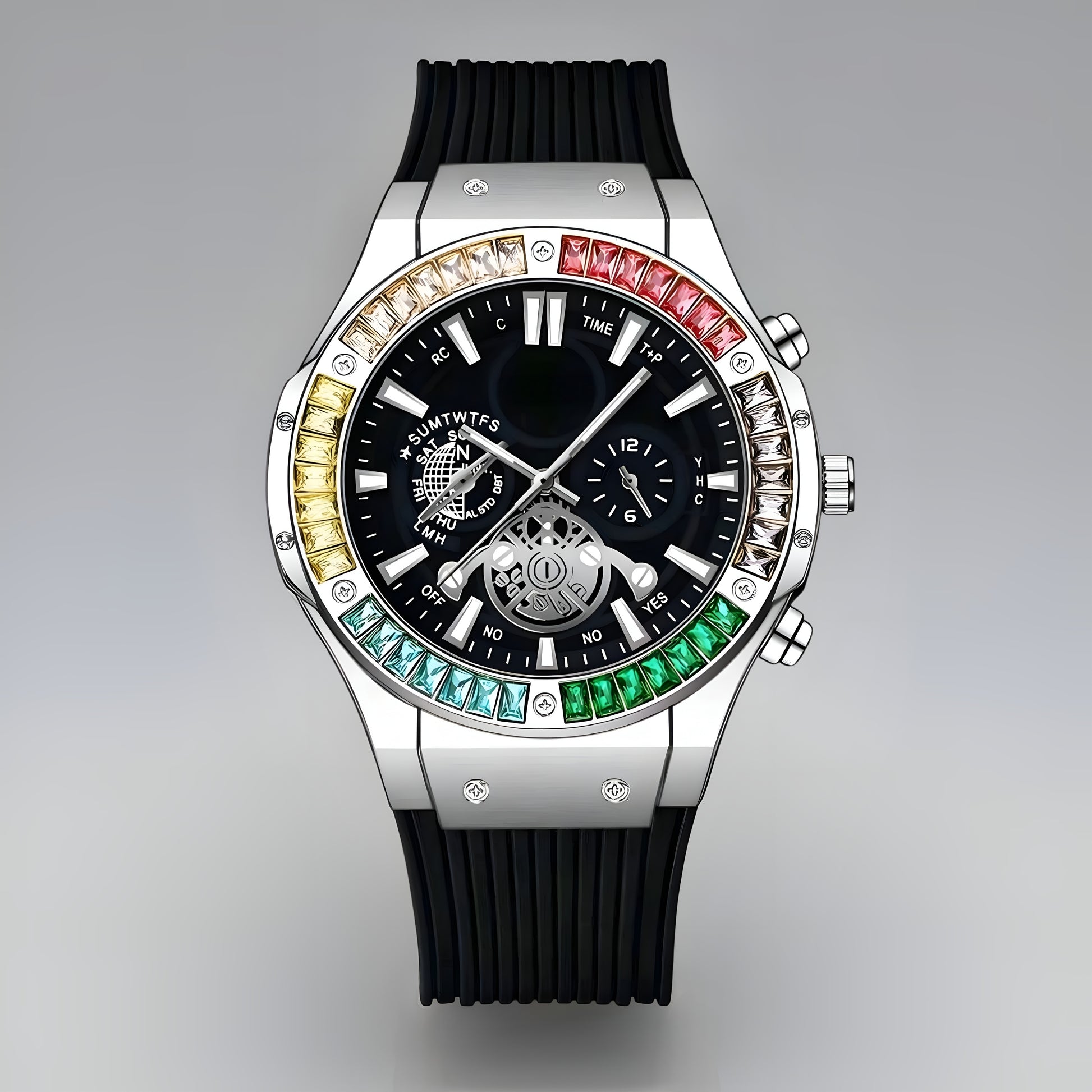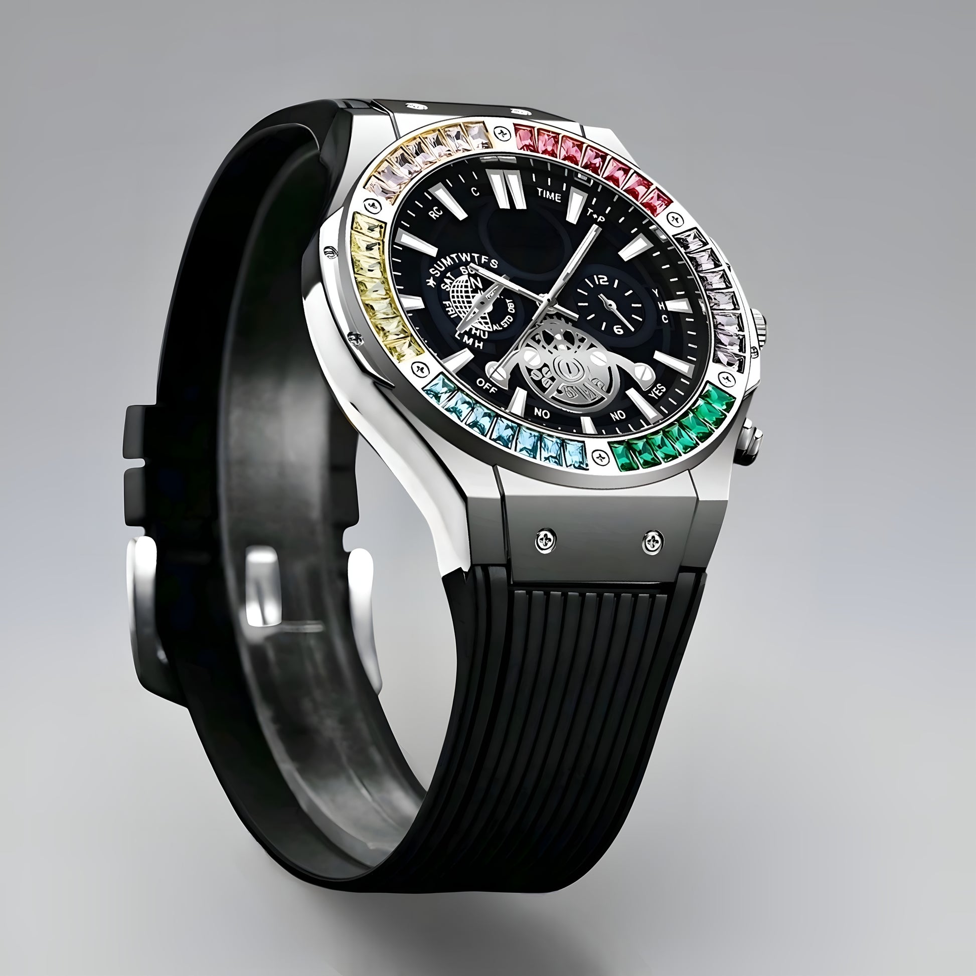 El Luminar Plata combina modernidad con lujo frío y sofisticado. Su cuerpo plata pulido crea un brillo exclusivo, acompañado por un bisel de cristales multicolor que le da un aura de pieza de colección.