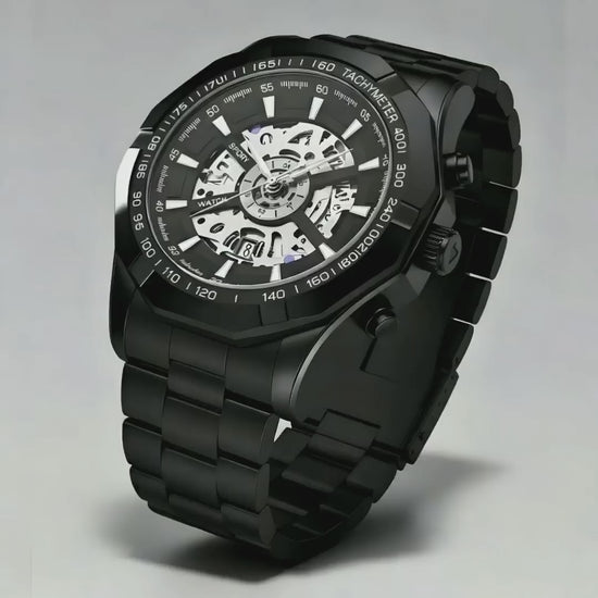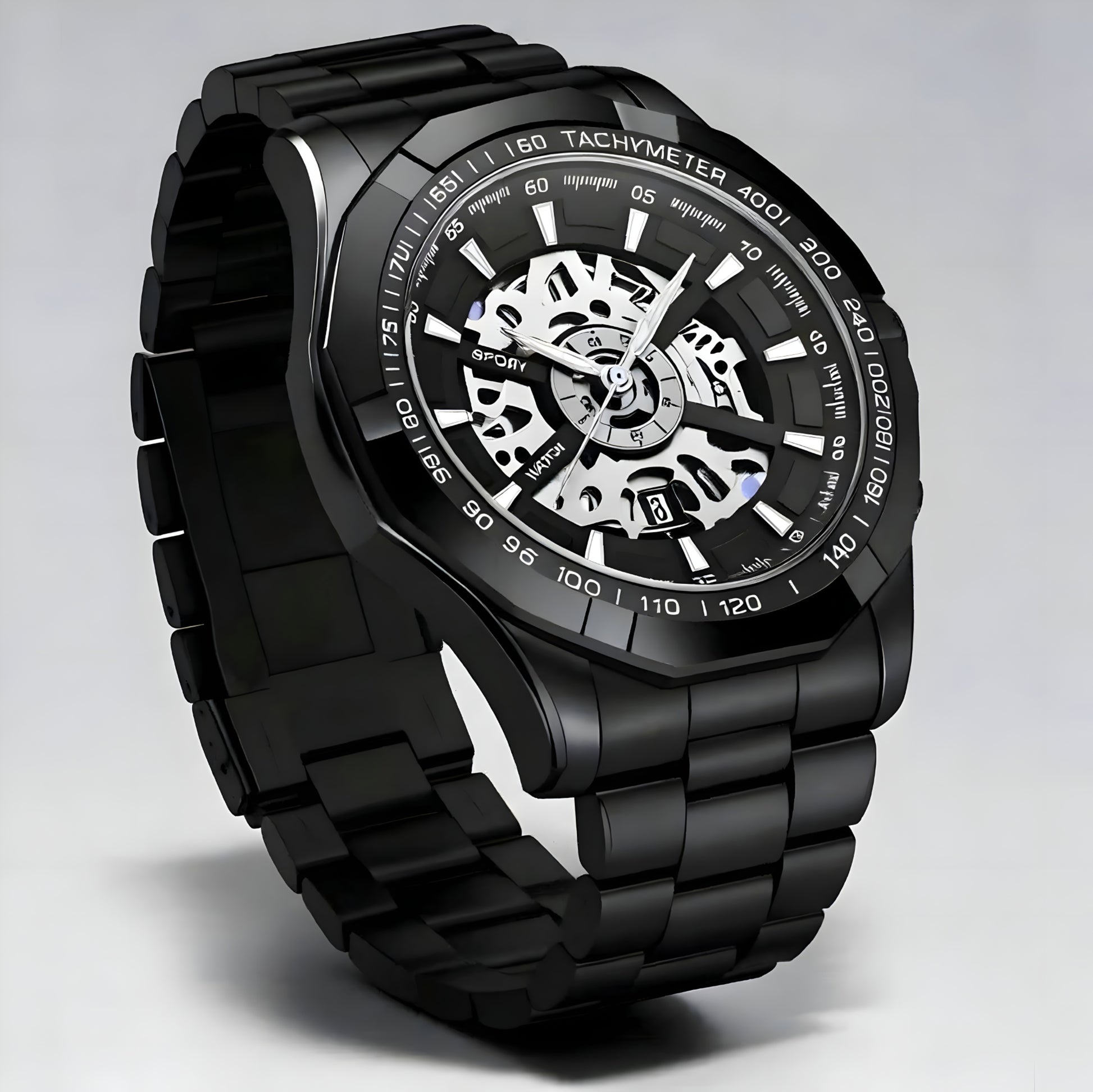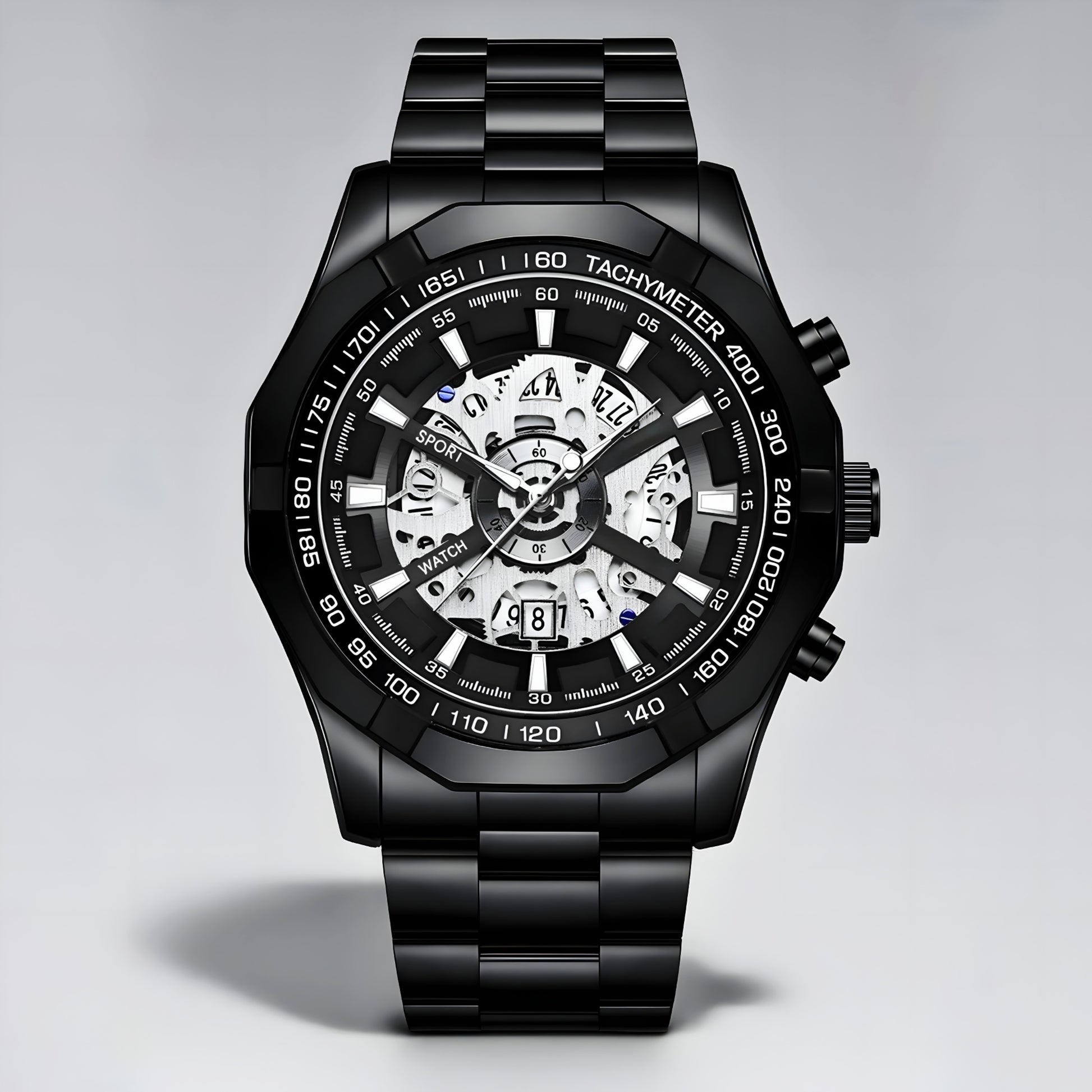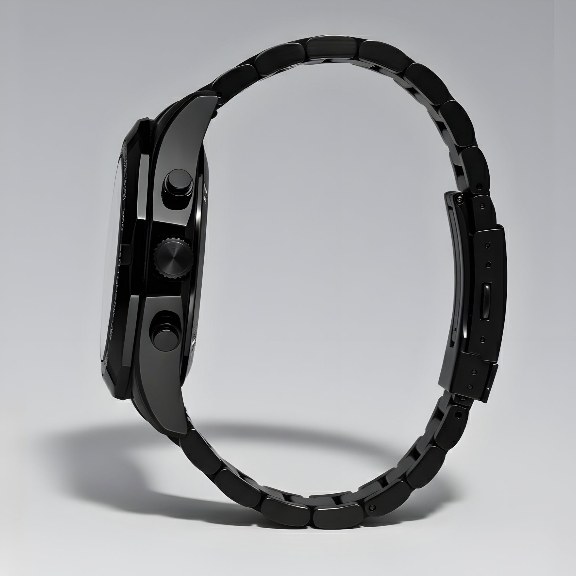 Nero Chronos es la elección perfecta: fabricado en acero inoxidable de alta calidad, con resistencia al agua y una presentación de lujo que refleja éxito y distinción. Un diseño robusto y sofisticado que lo acompañará en cada ocasión, dándole la confianza de portar en su muñeca un símbolo de poder y estilo atemporal.